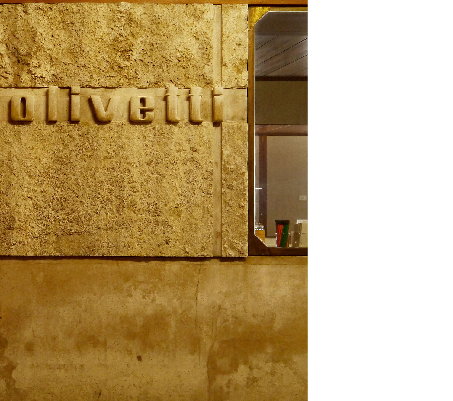 The side facade of the Olivetti showroom is a geometric composition in which there is a balanced fusion of past and future, old and new elements: the stone door with the gilded Olivetti logo overlapping the edges of a plain lintel and the door, a low concrete base supporting an Istrian stone band, the company name curved into a large stone plate, the big windows offering a glimpse of the space inside.